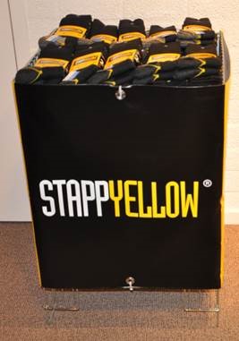 Sokken actiebak Stapp Yellow. (Bak zonder inhoud)Normaal ongeveer voor 120 bundels, verkooprek, sokken verkoop mand.