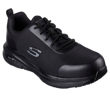 Skechers Arch Fit Ringstap S3 zwart: Geniet de hele dag van ondersteunend en dempend comfort met de Skechers werkschoen Arch Fit Ringstap S3 zwart. Deze slipbestendige veterschoen heeft een met 3M® Scotchgard® behandelde mesh en synthetisch bovenwerk, een uitneembare Arch Fit® binnenzool en een stalen veiligheidsneus.Ontwerpdetails:Ademend mesh en synthetisch bovenwerk, behandeld met 3M® Scotchgard® om water en vlekken te werenSportief ontwerp met vetersluitingHakhoogte van 3,8 cmSkechers® logo-accentBelangrijkste kenmerken:Gepatenteerd Skechers Arch Fit® binnenzoolsysteem met podoloog-gecertificeerde ondersteuning, ontwikkeld op basis van 20 jaar data en 120.000 voetscansUitneembare binnenzool die zich vormt naar je voet, schokken vermindert en de druk verdeeltStalen veiligheidsneus voldoet aan EN ISO 20345-2011 normen voor impact en compressieSlipbestendige (SRC) zool met olie- en benzinebestendige gripMetaalvrije, penetratiebestendige binnenzoolS3 SRC + ESD
