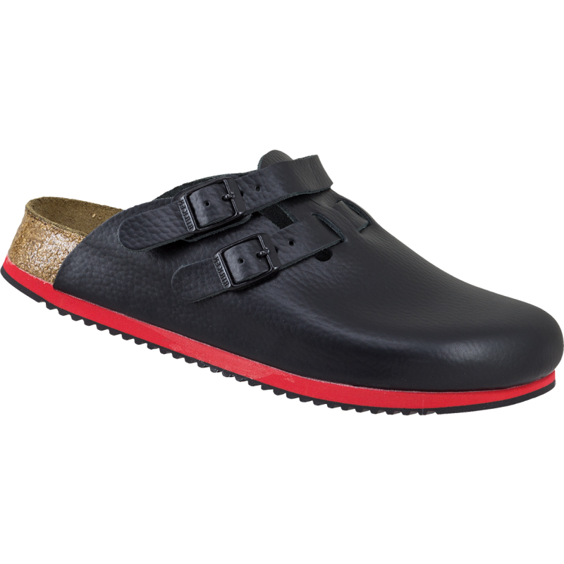 Lederen materiaal, Kurk/latex extra zachte anatomische gevormde suede voetbed, antislip rubberen zool met EVA tussenzool, Olie en vetbestendig, Omklapbare hielriemen.Normale leest