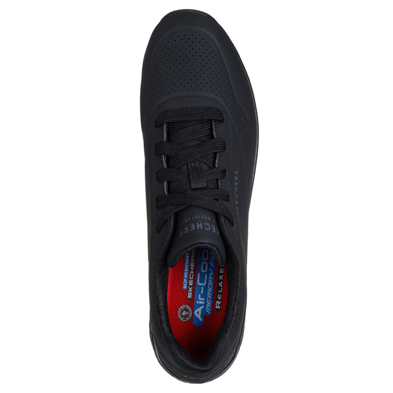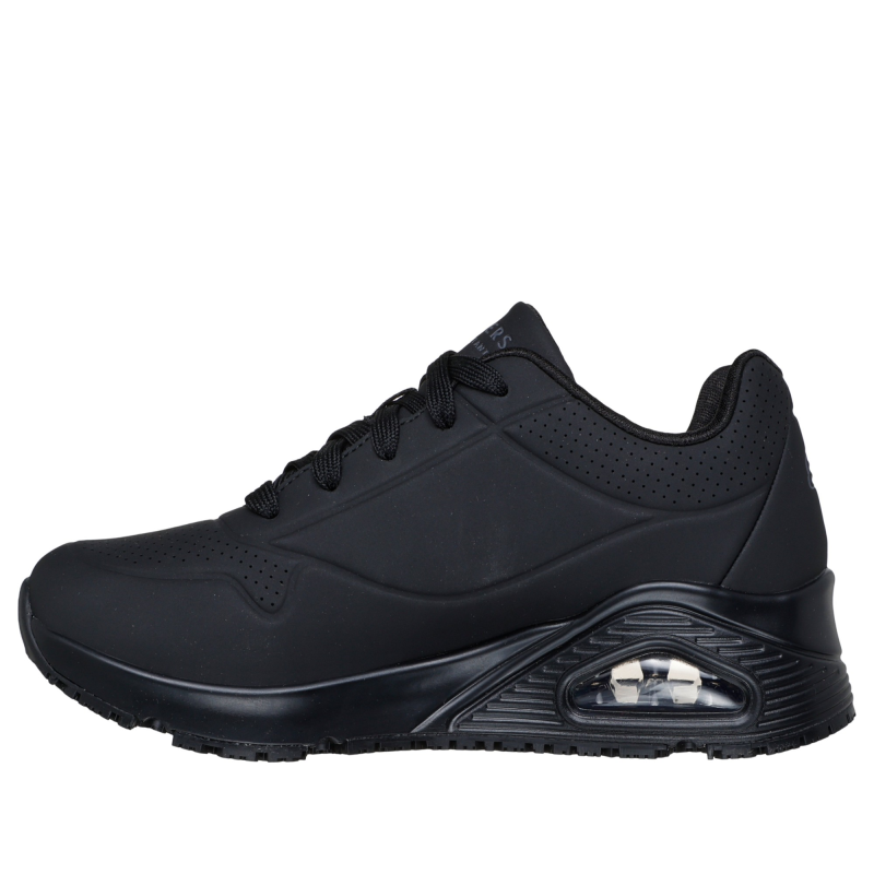 Skechers Uno O1 zwart (dames):Een favoriet model komt nu met comfort en veiligheid: de Skechers dames werkschoen Uno O1 zwart. Deze slipbestendige werkschoen heeft een duurzaam geperforeerd synthetisch Durabuck bovenwerk, een Skechers Air-Cooled Memory Foam® binnenzool en een Skech-Air® luchtkussen-tussenzool.Ontwerpdetails:Duurzaam geperforeerd synthetisch Durabuck bovenwerk met vetersluitingHakhoogte van 4,5 cmSkechers® logo-accentBelangrijkste kenmerken:Skechers Air-Cooled Memory Foam® comfortabel dempend voetbedSkech-Air® zichtbare luchtkussen-tussenzoolSlipbestendige (SRC) zool met olie- en benzinebestendige gripESD-ontwerp om statische elektriciteit te minimaliseren (EN IEC 61340-4-3:2018)O1 FO SRC + ESDVoldoet aan EN ISO 20347:2012