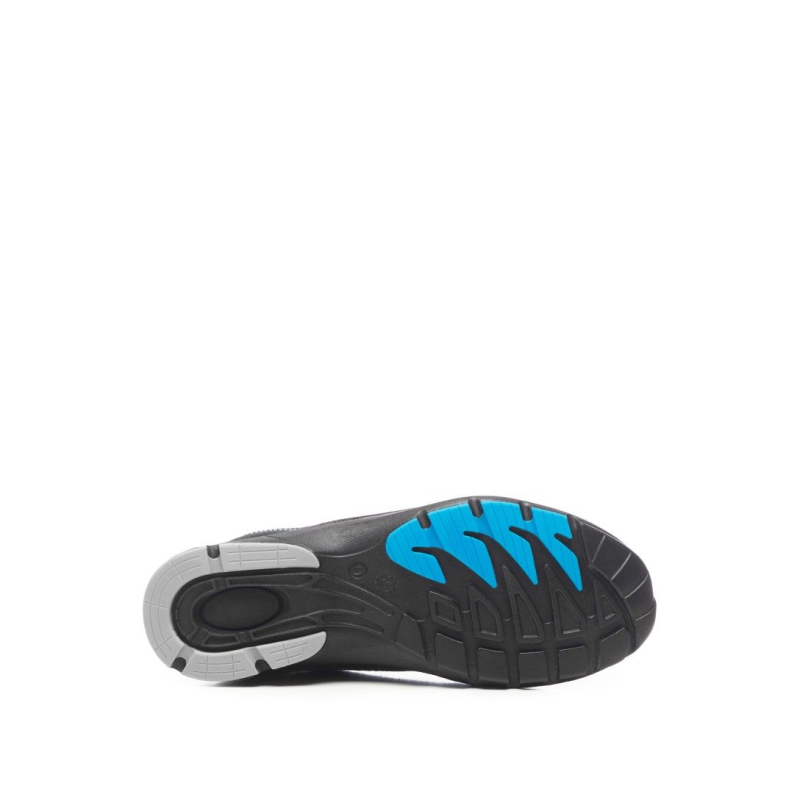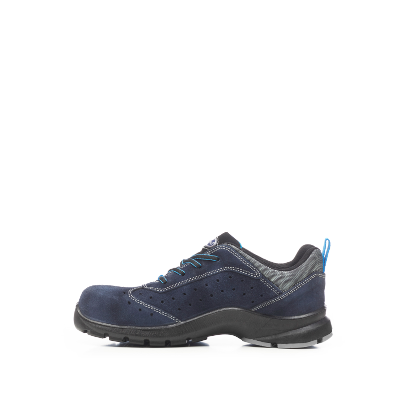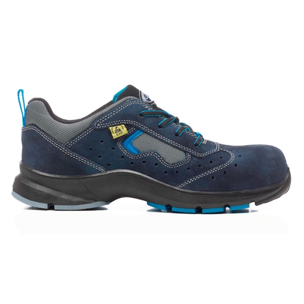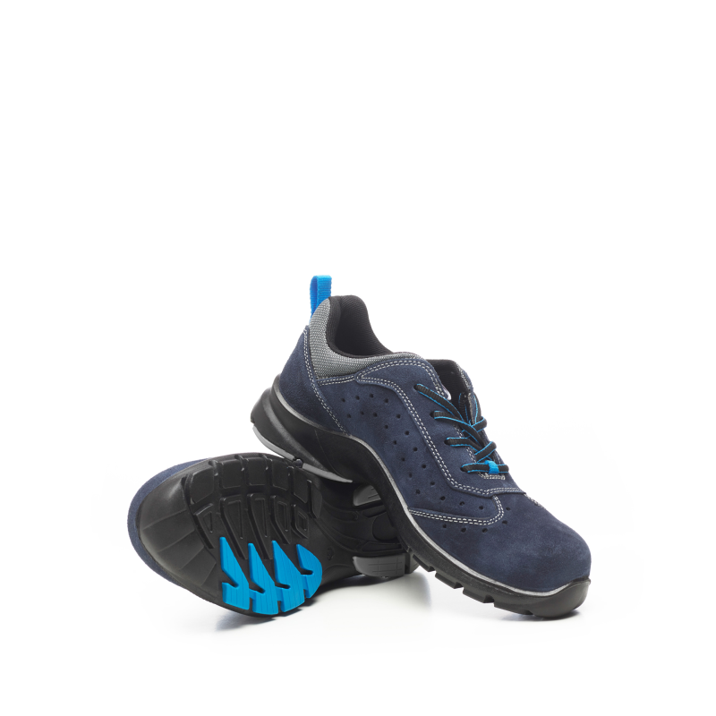Solar is an S1P SRC ESD safety shoe, perforated, in blue suede split leather. Breathable Crambelle lining, composite toe, PU/TPU sole. 100% metal-free. Sizes 36-48. Ideal for logistics, transport and outdoor use.