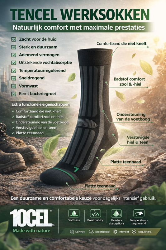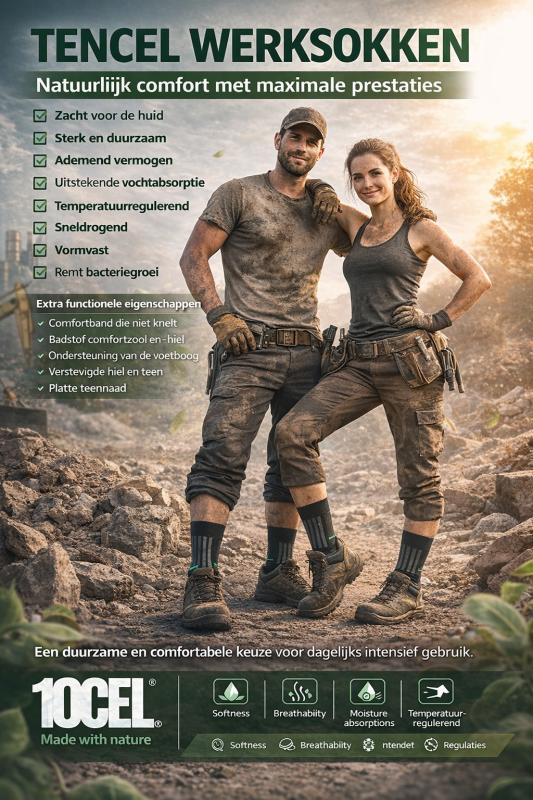 Tencel (Lyocel l) is een natuurvezel gemaakt van houtsnippers uit eucalyptus of beukenbomen van duurzaam beheerde bossen. Door het gesloten systeem wordt 99% van het productiewater hergebruikt en hierdoor komen een van de milieuvriendelijkste garens beschikbaar. Made in Europe NL 78% tencel, 20% Polyamide, 2% elastane Tencel is zacht Tencel is sterk Tencel ademt Tencel absorbeert Tencel reguleert. Tencel droogt snel Tencel krimpt en kreukt nauwelijks Tencel remt bacteriegroei 10CEL Toprock sokken hebben geen voelbare teennaad Overdoos = 96 paar per maat