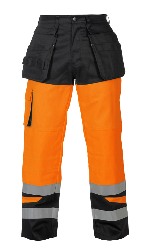 Brandvertragende en Antistatische Werkbroek, Verhoogd ruggedeelte, Verstelbaar in taille met elastiek, 2 Steekzakken met klep, Dijbeenzak met klep, Dubbele duimstokzak, 2 Achterzakken met klep, Kniezakken, Swingpockets separaat te bestellen, 60% katoen, 38% modacryl, 2% antistatic.
