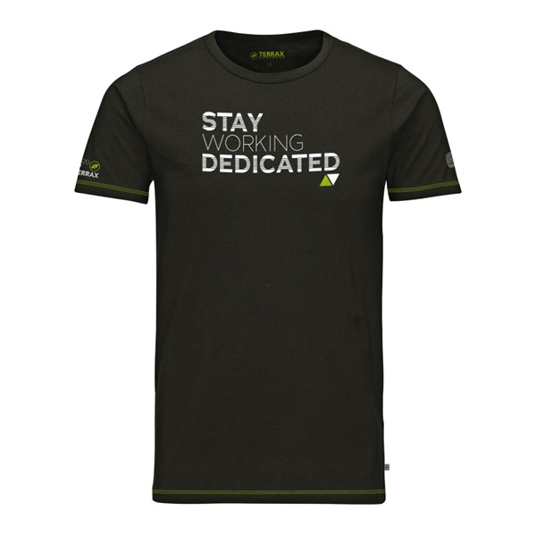 T-shirt met ronde hals, grote print aan de voorkant, contrasterende naden, Terrax Workwear-label.● Bovenmateriaal 1: 100% katoen.