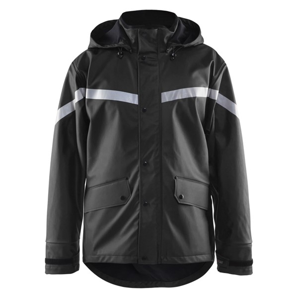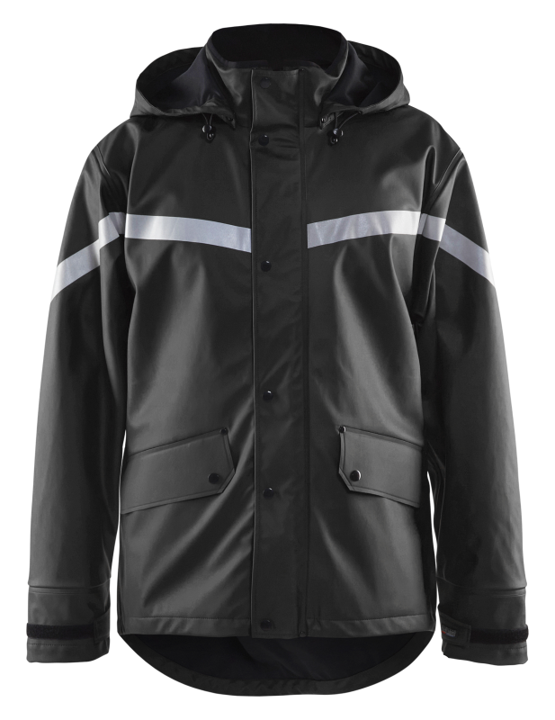 Regenjas voor diegenen met werkzaamheden die sterke, duurzame maar soepele regenkleding nodig hebben. Gemaakt van sterk wind- en waterdicht materiaal met gelaste naden, ventilatie opening in rugpand en druppelgoot in de boord. De jas heeft een afneembare, verstelbare capuchon, zachte fleece gevoerde kraag en voorzien van eenvoudig toegankelijke voorzakken zoals grote voorzakken met klep en drukknoopsluiting en napoleonzak aan binnenkant. De sluiting is een sterke verborgen 2-weg ritssluiting tot in de kraag met daarover een stormsluiting met drukknopen. De jas heeft een goede pasvorm, verstelbare manchetten met klittenband en neopreen windvanger die het lichaam warm houdt, ook al is het nat.Gecertificeerd volgens EN 343Gelaste nadenWind- en waterdichtVerstelbare manchettenNapoleon-zakVerlengde rugalternatief voor Blåkläder Regenjas LEVEL 2 43222003